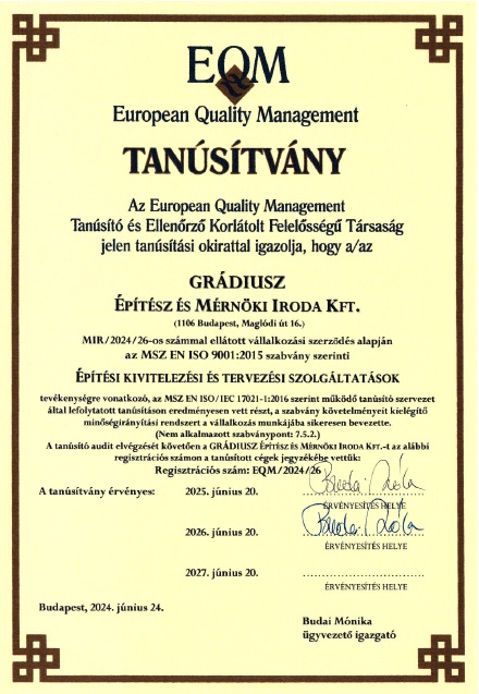 Minőségbiztosítás: MSZ EN ISO 9001:2015 szerint (Tanúsítvány)